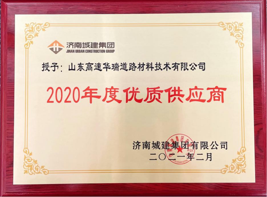 近日,山東高速華瑞道路材料技術(shù)有限公司榮獲濟(jì)南城建集團(tuán)有限公司“2020年度優(yōu)質(zhì)供應(yīng)商”榮譽(yù)稱號,華瑞公司已連續(xù)五年獲此殊榮。