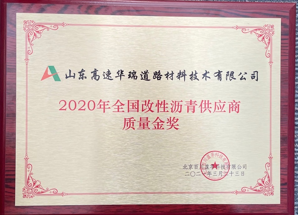 華瑞公司榮獲“2020年全國(guó)改性瀝青供應(yīng)商質(zhì)量金獎(jiǎng)”榮譽(yù)稱號(hào)