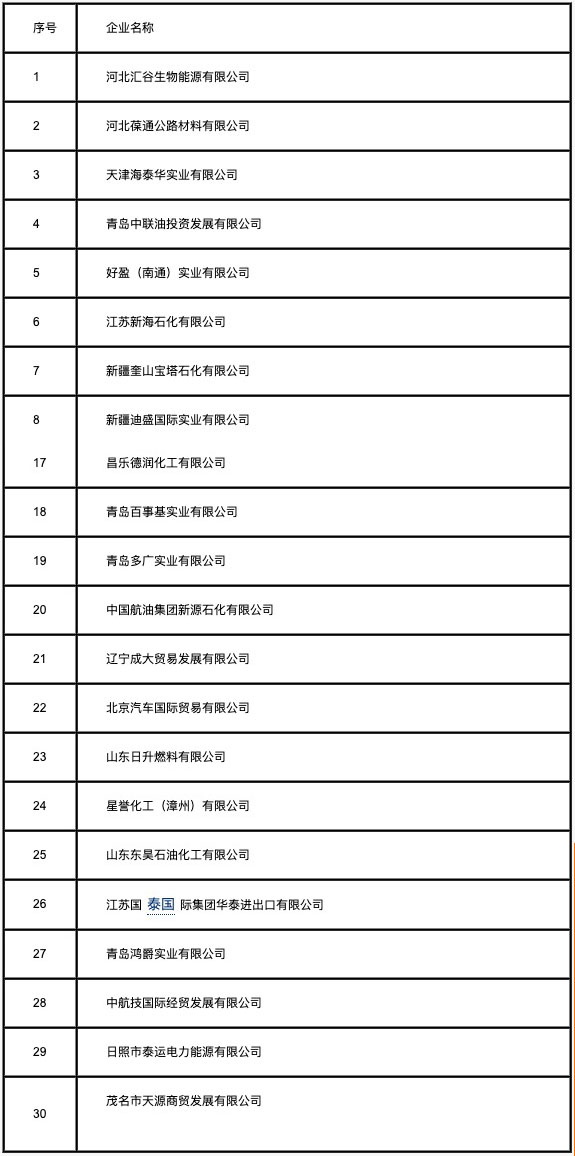 根據(jù)商務(wù)部2012年第66號(hào)公告《公布2013年燃料油非國營貿(mào)易進(jìn)口允許量申領(lǐng)程序、分配原則》(以下簡稱《公告》)的要求,中國五礦化工進(jìn)出口商會(huì)對(duì)新申請(qǐng)2013年第二批燃料油非國營貿(mào)易進(jìn)口企業(yè)報(bào)送的材料進(jìn)行審核,商務(wù)部外貿(mào)司對(duì)審核情況進(jìn)行了復(fù)審。截止2013年3月31日,共有41家企業(yè)報(bào)送了申請(qǐng)材料,其中符合《公告》要求的有30家企業(yè),現(xiàn)將材料齊全企業(yè)名單進(jìn)行公示,公示期為2013年4月19-25日。公示期間,對(duì)公示名單有異議的,可向商務(wù)部(外貿(mào)司)提請(qǐng)公示復(fù)核。同時(shí)公布材料不齊全企業(yè)名單及所缺材料,公示期間,各相關(guān)企業(yè)仍可將補(bǔ)充材料報(bào)送至商務(wù)部外貿(mào)司,同時(shí)抄送中國五礦化工進(jìn)出口商會(huì)。