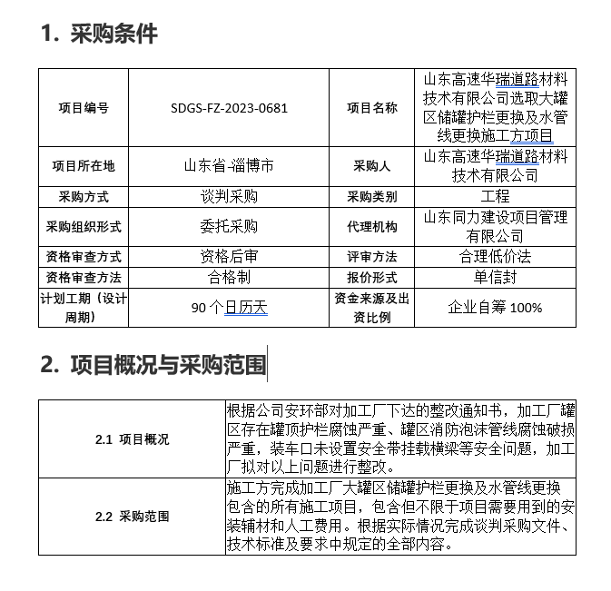 山東高速華瑞道路材料技術(shù)有限公司選取大罐區(qū)儲罐護欄更換及水管線更換施工方項目項目采購公告