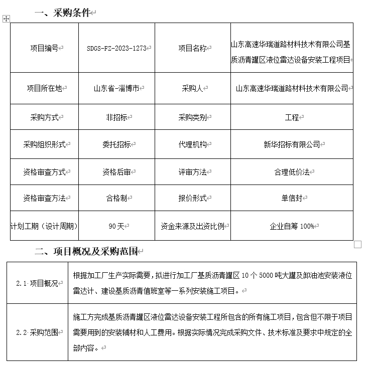 山東高速華瑞道路材料技術有限公司基質瀝青罐區(qū)液位雷達設備安裝工程項目談判采購公告